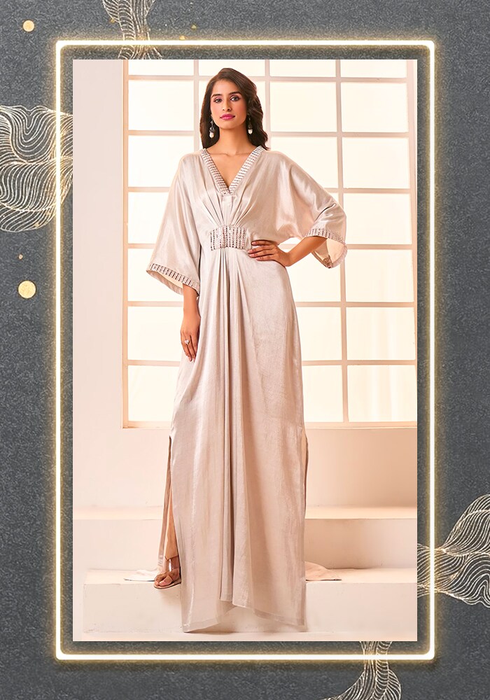 The right word to describe this Kaftan: tantalizing. With edgy cuts & lustrous satin, this chic outfit is one to make a statement with on New Year’s Eve. The unconventional asymmetry is paired with a deep neckline and embroidery work, making it an ideal candidate for effortless style.