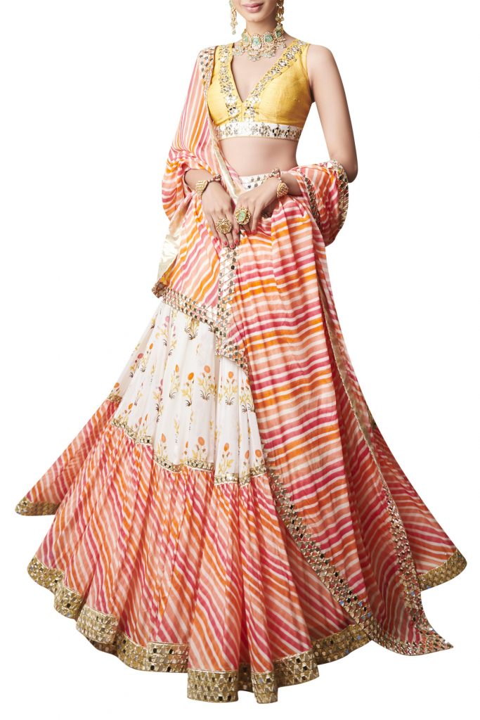 Hand-dyed leheriya lehenga set with mirror work detailing is ideal for afternoon summer weddings. These are best paired with statement choker necklaces and minimal make-up.