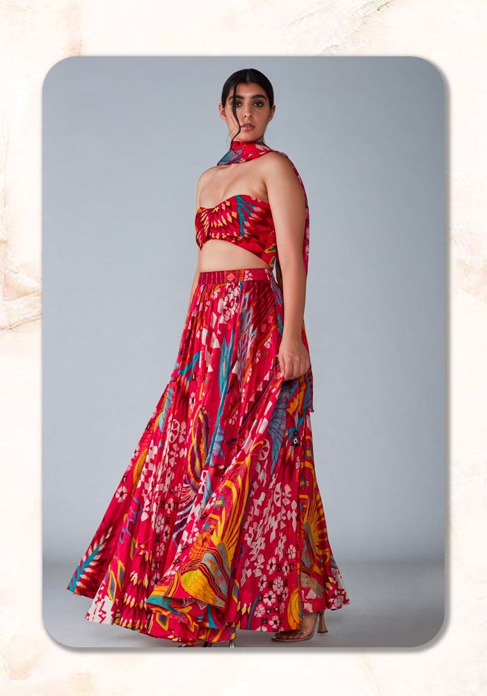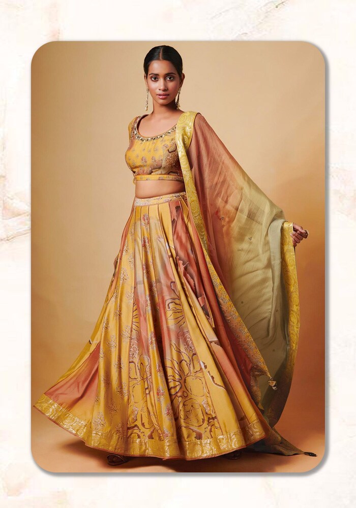 About- Printed kalidar lehenga with an embroidered blouse and organza dupatta