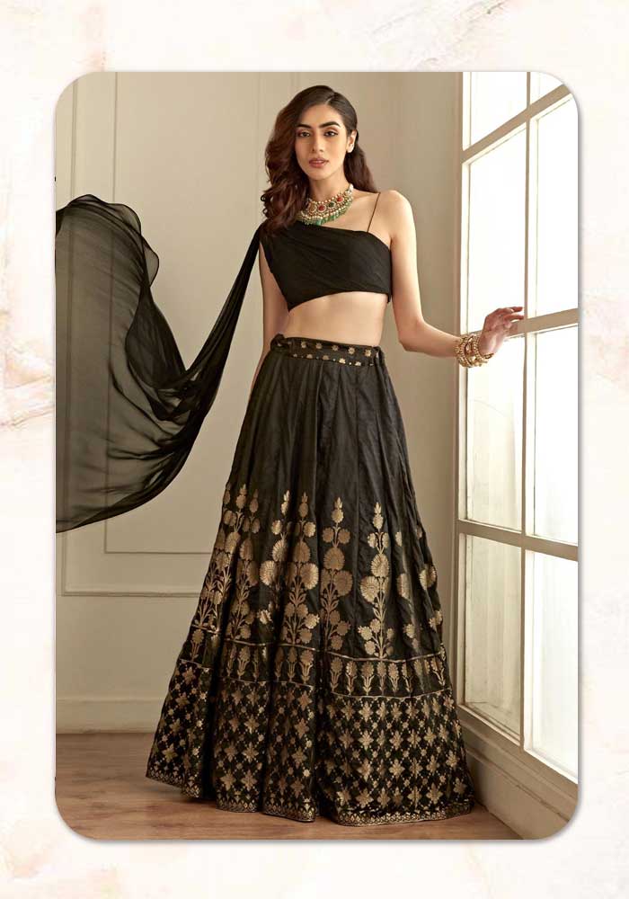 About- Black koel one shoulder blouse and Banarasi silk skirt