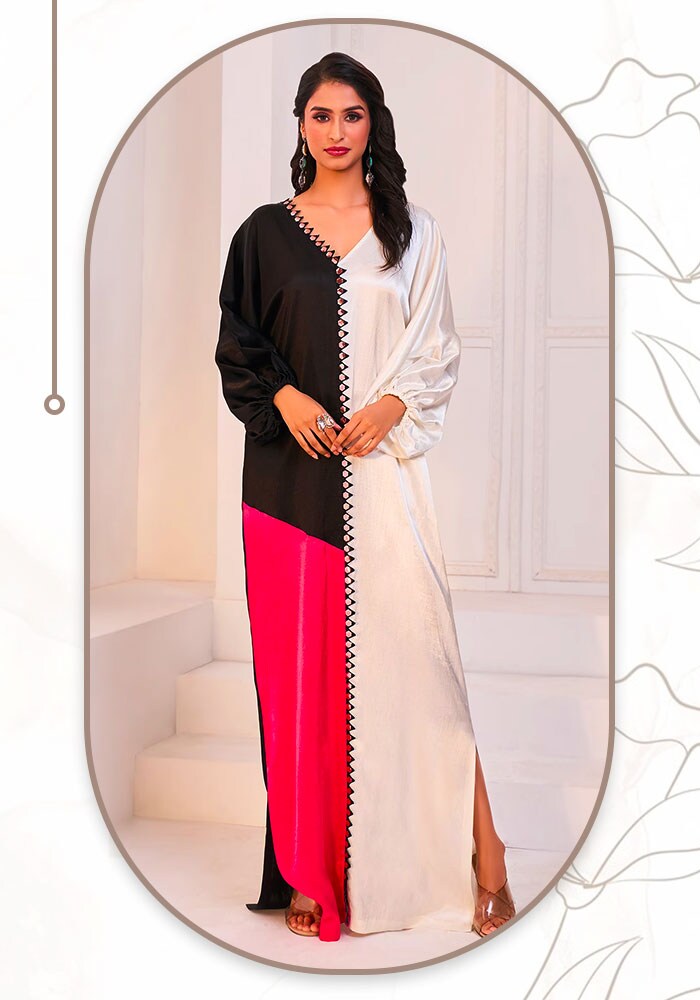 A regal appearance reckons itself in this sultry shade, and the rich organza fabric really pieces the whole look together. With a cape-like structure and a twisted knot front, this Kaftan remains an elusive piece from the designer’s collection.