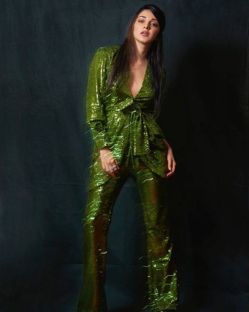 If monochrome outfits are not your thing, then, there’s a bevy of party-apropos, high-voltage shine outfits as seen on Malaika Arora and Sonal Chauhan (would you look at the plume detailing on that outfit, though!) who wore these styles to the Filmfare Awards. Want to go edgier? Turn to Kiara Advani’s shiny pantsuit from label Cinq A Sept to make the most impact. If you’ve ever wanted to ride the crest of the ‘bling’ trend, now would be the time.