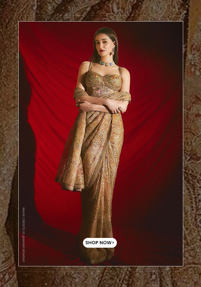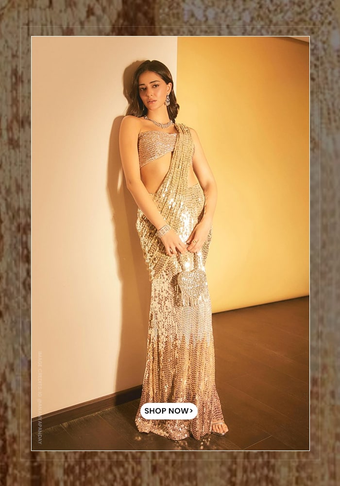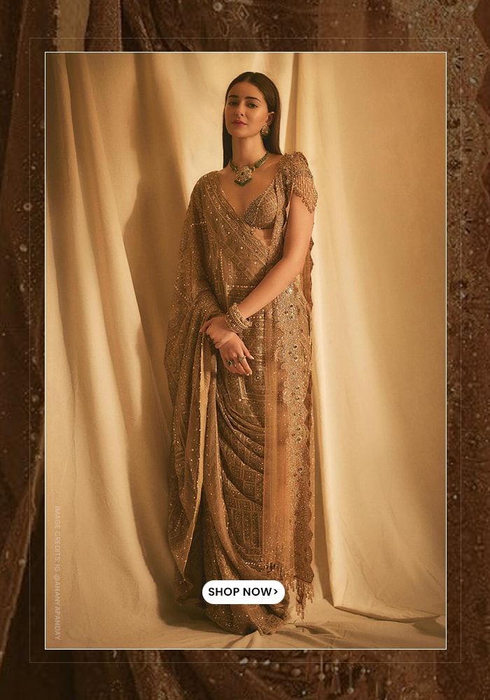 Ananya dazzled everyone with this glamorous saree by Manish Malhotra. This fancy saree is adorned with gold sequins from head to toe paired with a matching gold bustier blouse, making it an ultra-glam look. Embracing the ultimate festive shimmer in a Bollywood style drape, Ananya’s confidence and glam look made this outfit the epitome of luxury and perfect for grand occasions.