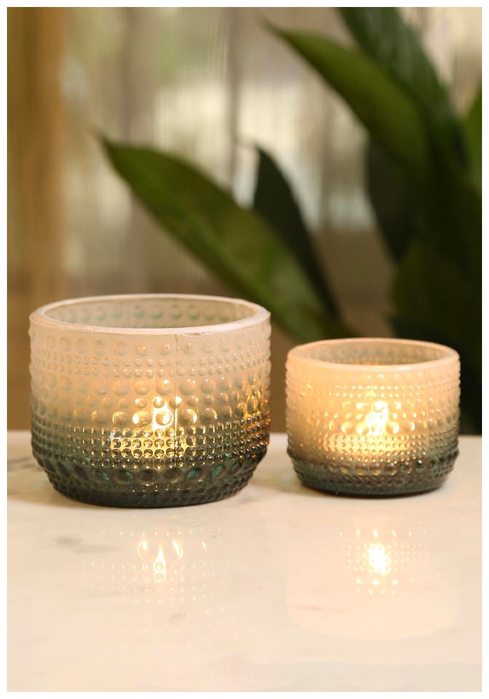 Add a touch of dual tone with this ombre glass votive holder to your home decor. Carved with a dot design, this is a perfect piece to catch the eye.