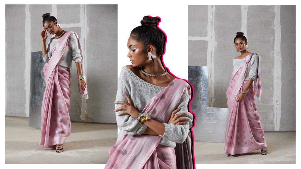 Put a neo-modern spin on your otherwise traditional saree by trying out different ways of wearing your pallu. Instead of letting it fall over your shoulder as usual, bring it around your neck – somewhat resembling a Parisian knot – and cut your effort of managing a trailing pallu in half. This look is perfect for an occasion like a friend’s pre-wedding mehendi ceremony, where you’d want to go handsfree. Borrow some bling in the form of chunky gold jewelry. Look 3: Street style-savvy Featured saree: Printed chanderi silk saree from Nazaakat by Samara Singh Over the course of the last few years, terms like athleisure and street style have become a mainstay in our fashion lexicon. Borrowing heavily from this subculture, we’re subverting traditional blouses for comfort in the form of our otherwise closet staples. Think t-shirts and sweaters.