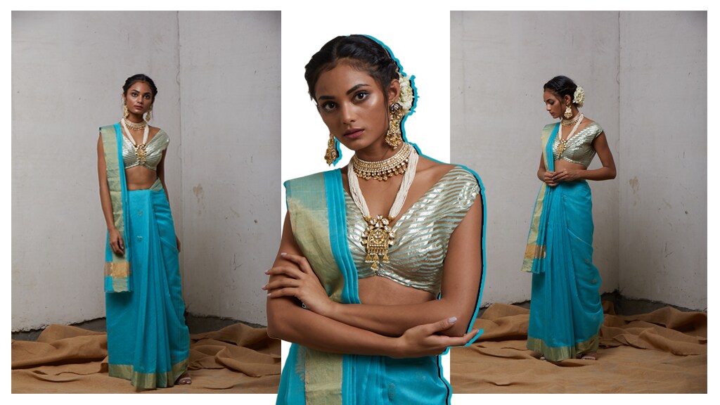 Switch up your style by wearing your favourite sweater as your blouse. If that isn’t edgy enough, knot your pallu as you throw it over your left shoulder. Not only is the knit top super comfortable, it also eliminates the need to safeguard your saree with 15 different strategically placed safety pins - making it that much less cumbersome. (Less work for you and mom. Yay.) Gather your hair in a top knot, accessorize with tribal-inspired metal jewelry and finish with a strong metallic eye. Look 4: Hero Blouse Featured saree: Pure chanderi handloom saree by Samyukta Singhania Sure, we’re super trend-savant and don’t mind injecting our heritage sarees with a little bit of rebel spirit. But there are occasions which still demand the saree to feel traditional. In such cases, look toward the humble blouse for some much-needed respite.