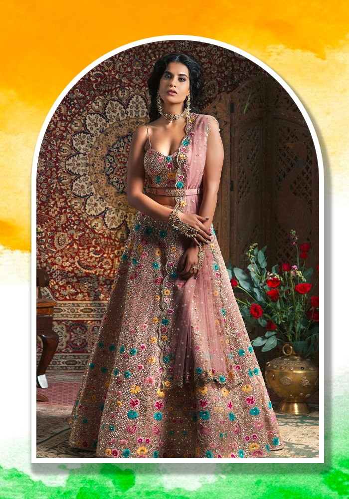 A sartorial classic and a fashion favorite for centuries, lehengas have been royalty’s preferred address. A decked out, embroidered lehenga set has had a mainstay in wedding wardrobes ever since it amassed huge popularity in the nineties. Likewise this floral embroidered piece brings flowers to life on a soft pink canvas and its beauty shows exactly why lehengas are so loved!