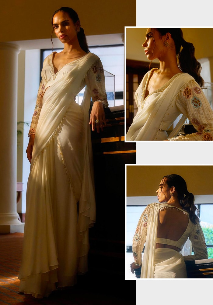 Elevate your traditional style with this pre-draped white saree, adding a touch of whimsy. The pristine white color is perfect for celebrating Navratri, symbolizing purity and elegance during the festivities.