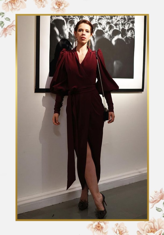 Kalki Koechlin looks suave in a Gauri & Nainika micro wrap around shirt dress. The maroon dress is highlighted by the long pouf sleeves that show the convergence of two contrasting silhouettes, making for an instant classic.