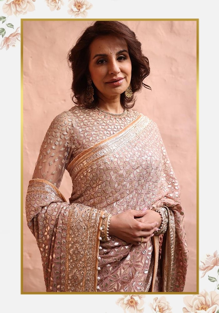 Reena Wadhwa looks pretty in pink, as seen here in an old rose piece Tarun Tahiliani saree in georgette mukaish. The pink saree features intricate geometric embroidery and sequin trinkets that catch the eye.
