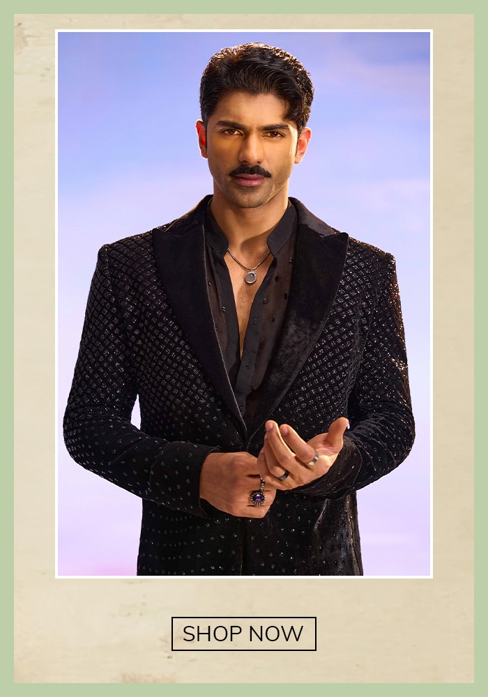 A fun celebration, the henna ceremony often comes with an unsaid dress code; Green. So, your groomsmen can adorn a green kurta or sherwani during this fun celebration. Moreover, to dress up your friends in a regal yet classic look, you can shop this green sequin-laden Nehru Jacket.
