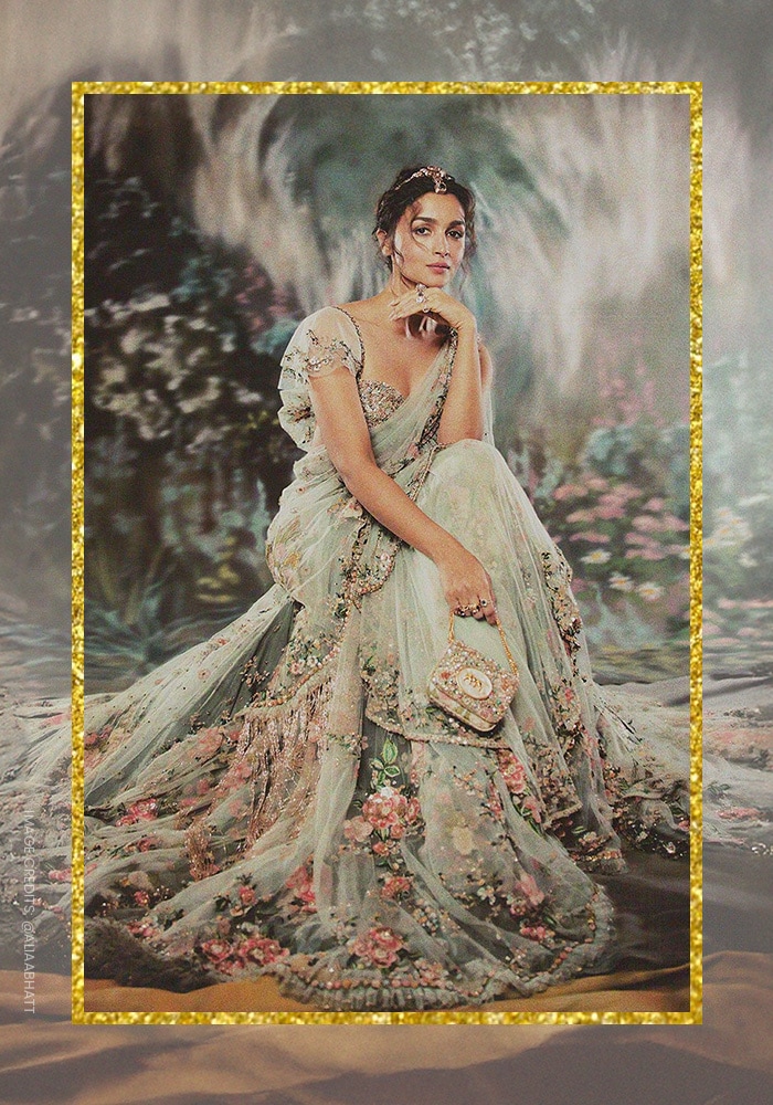 Alia Bhatt dazzled in a Sabyasachi saree hand embroidered with beads, sequins, and stones. The attire is paired with Sabyasachi High Jewellery.