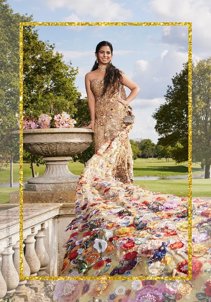 Isha Ambani wore a bespoke creation by Rahul Mishra, flourishing with designs of flowers, butterflies, and dragonflies using appliqué and embroidery.