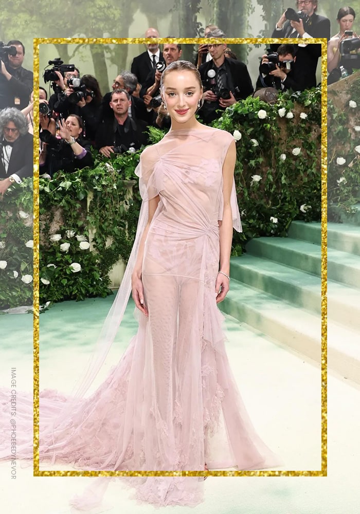Phoebe Dynevor elegantly walked in a custom-made Victoria Beckham creation. The ethereal gown is crafted using tulle and lace that features delicate flowers.