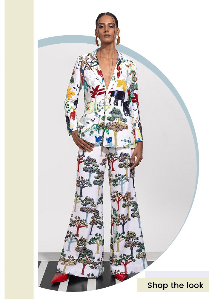 From the limited-edition collection, this co-ord set features forest & tiger patterns that capture the essence of adventure and glamour. An apt pick for evening galas, you are sure to be the talk of the town. Keep the accessories minimal and let the fierce tiger patterns speak for themselves.