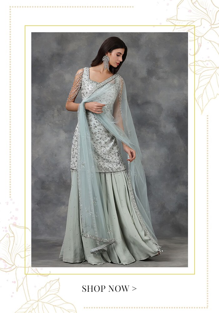 The Sangeet calls for slightly more charming attire. Fusion kurta sets with jackets, shimmering lehengas, and several other kinds of outfits would go very well for the ceremony. You can even opt for an embellished kurta sharara. It will give you a stunning look while offering comfort and ease of movement so you can dance your heart out.