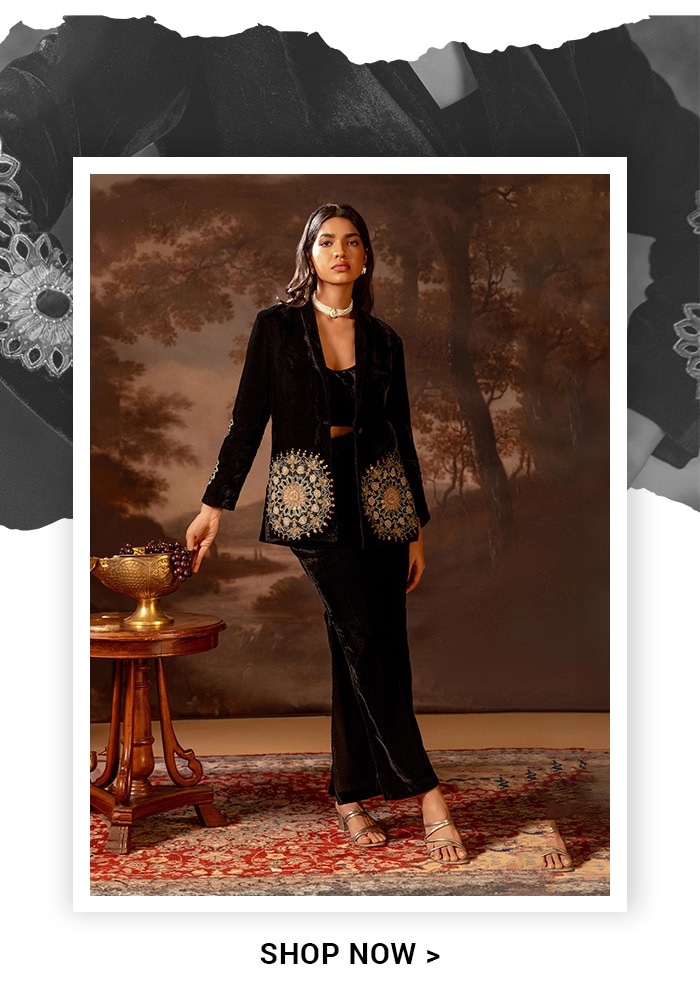 A fusion of Western and traditional elements, this Soup by Sougat Paul creation is perfect for festive and formal occasions. Crafted with luxe velvet with an ethnic twist, this blazer pant set is ideal for achieving a sophisticated and stylish look. If you are looking for a chic plus-size dress online, this is the one for you.