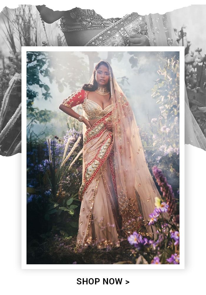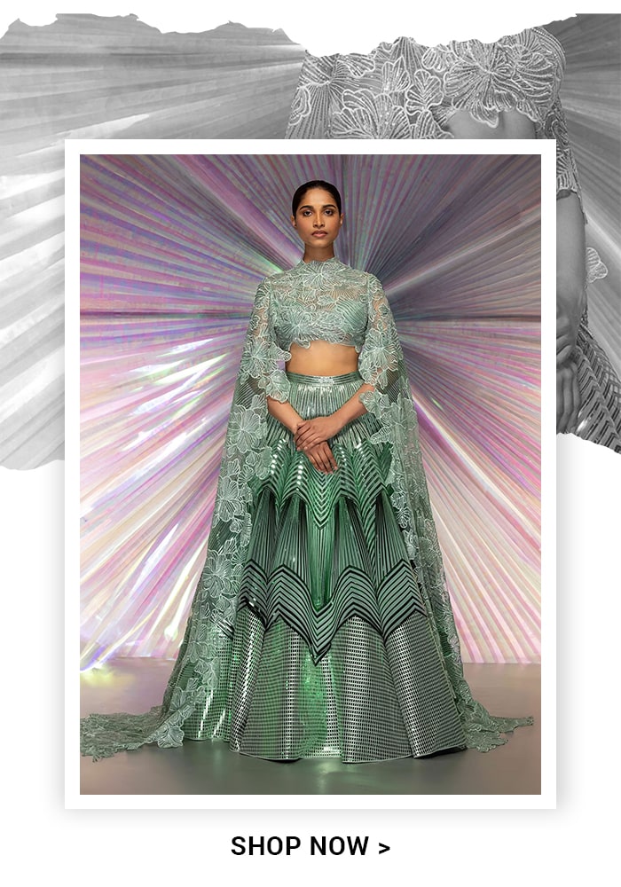 Who wouldn’t love an Amit Aggarwal creation in their collection? A metallic structured lehenga in a phenomenal green tulle colour, this is a quintessential bridesmaid outfit. With a hand-embroidered cape sleeve blouse, it is the comfortable yet stylish plus-size fashion clothing you need for this wedding season.