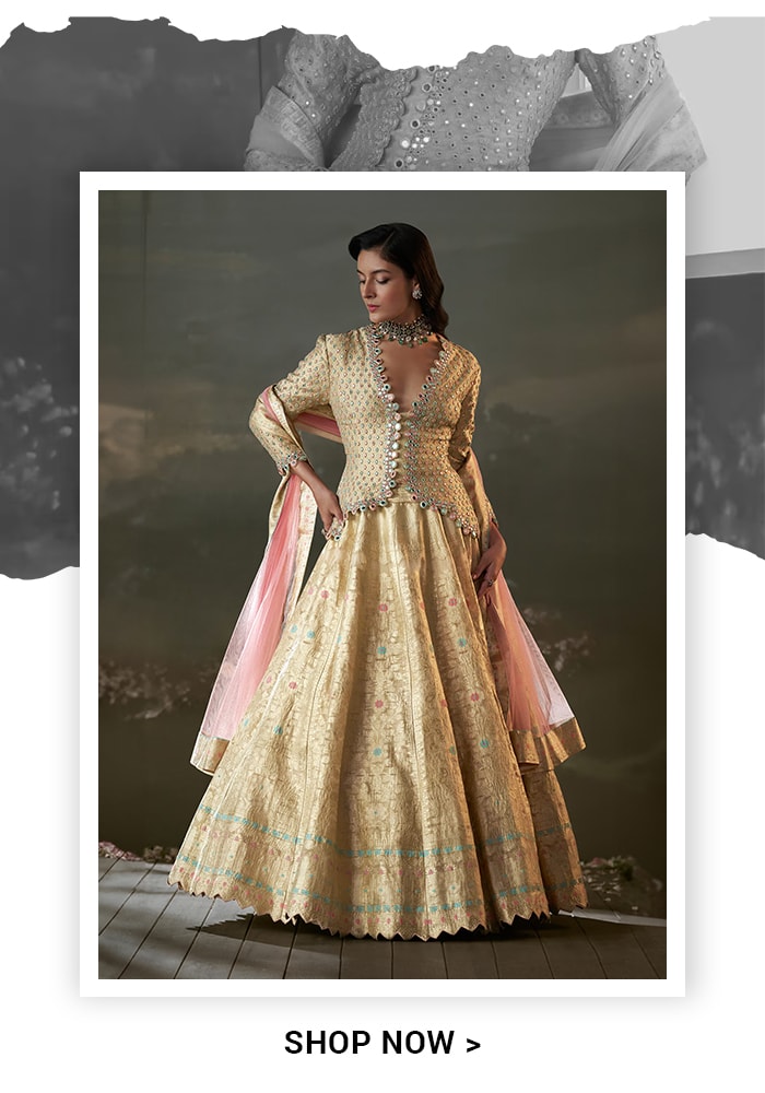 This Nikita Gujral lehenga is perfect for when you want a traditional look with a hint of contemporary finesse. A jacket-style lehenga adorned with mirror detailing is a great choice when it comes to buying Indian outfits for plus-size fashion. Comfortable yet graceful, this designer creation is ideal for weddings and other extravagant occasions.