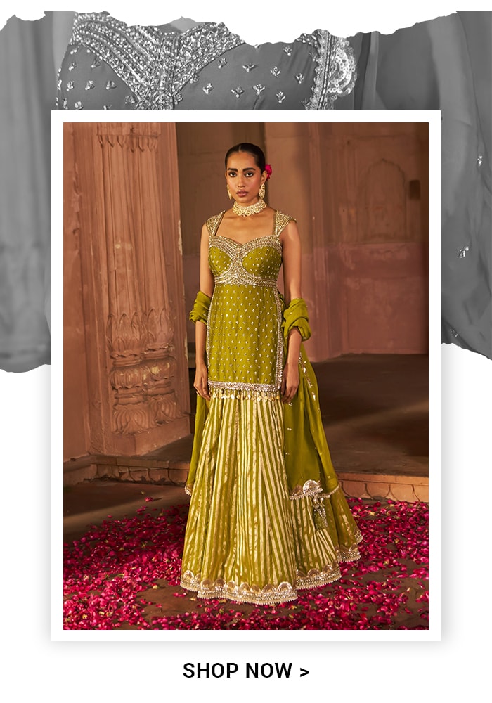 Want to stand out at your friend’s engagement party? We have a gorgeous option in store for you. This purple sharara set by Aariyana Couture comes with intricate threadwork embroidery and a scallop-edged dupatta. Moreover, to elevate your wardrobe with exquisite designs, this is one of the plus-size fashion brands you should watch out for.
