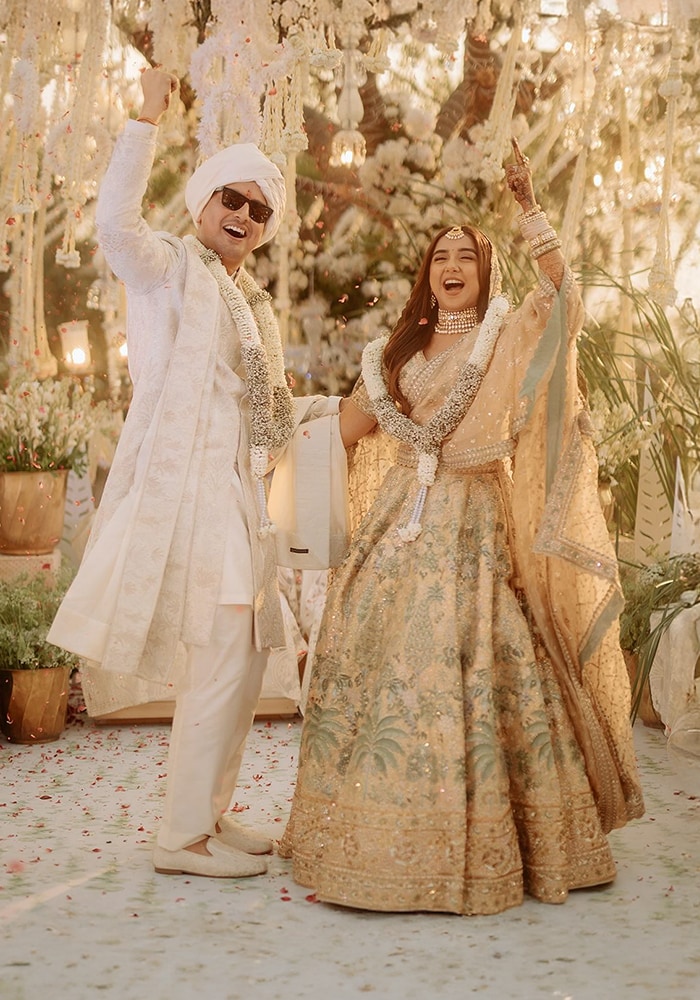 For the big day, Prajakta Koli chose to be an Anita Dongre bride. Wearing a custom gold lehenga set she looked radiant as she walked down the aisle. Her lehenga skirt beautifully showcased botanical embroidery including one of the Parijit flower (nighttime jasmine) that is synonymous with her own name! Also featuring Pichwai pantings and pockets, the bride completed the look with two embellished dupattas and jewellery from the same label. On the other hand, Vrishank donned an ivory sherwani to go with the gold lehenga.