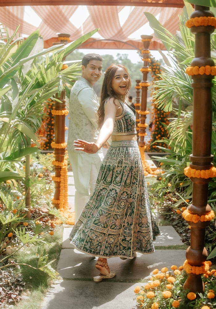 When it came to her wedding trousseau, Prajakta chose to start with a head-to-toe Anita Dongre look. Donning a gorgeous emerald green ankle-length lehenga and blouse set, the bride-to-be looked like a reincarnated Indian barbie. Intricately hand embroidered by female artisans of the SEWA foundation, the outfit was especially custom-made for the social activist. The nature inspired embroidery elevated with gold toned borders, seamlessly merged traditional designs with modern aesthetics. Khanal complemented Koli in a custom olive Nehru jacket from the same designer.
