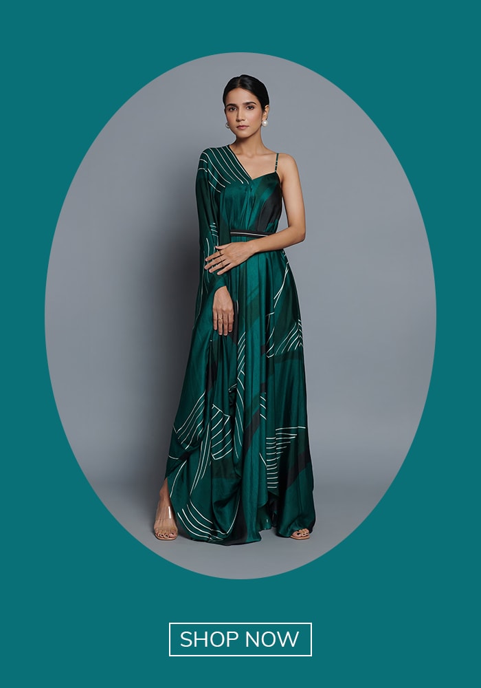 It is hard to think of any other couture option more versatile and suitable for a comfortable outing and staycation than a kaftan. A universal favorite amongst women who prioritize ease of movement and flexibility, the billowing silhouette is no more confined to luxury resort wear but is now embraced as a festive-approved staple too, think green satin v-neck kaftan from label Vedika M.