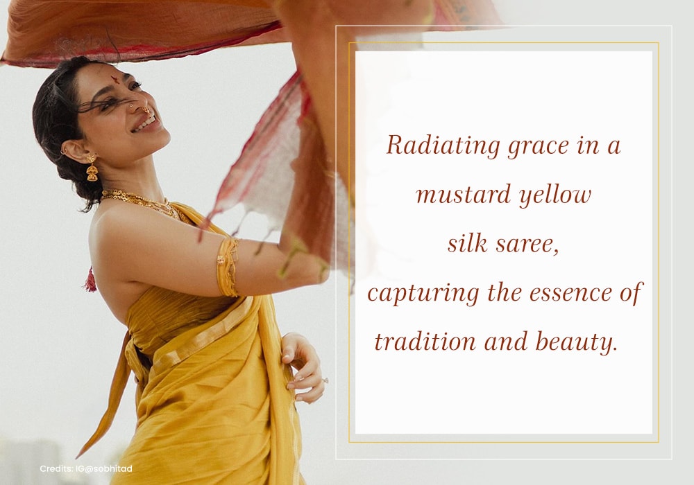 This event truly highlighted the essence of her Telegu heritage. Sobhita wowed everyone in a mustard cotton saree paired with a bandeau blouse, complemented with gold jewellery. Her look exuded royal charm with understated elegance. An orange dupatta finished her attire as she took part in rituals with her parents. The special part about this look is the tribute to her maternal lineage, keeping her grandmother close to her heart on this significant day.