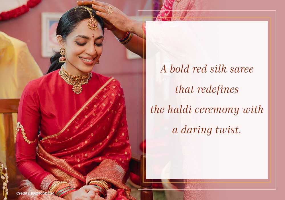 This event is usually known for its bright yellow hues all around. However, Sobhita redefined tradition by choosing a red Kanjeevaram saree by Ritika Mirchandani for the Pelli Kuthuru ceremony. Her red silk saree had detailed golden brocade work showing off her daring bridal style. She elevated her look with intricate designer jewellery pieces. This bold red South Indian bridal saree inspiration created a rich look that stood out from the typical tradition for this occasion.