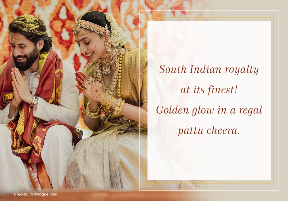 How much are you crushing over Sobhita Dhulipala bridal looks? Take notes from Sobhita's traditional South Indian bridal wear. From her thoughtfully curated outfits to the heartfelt tribute to her culture and family roots, she embodied the quintessential South Indian bridal aura. With her stunning bridal style, Sobhita left us all in awe. We wish the couple a lifetime of love and happiness!