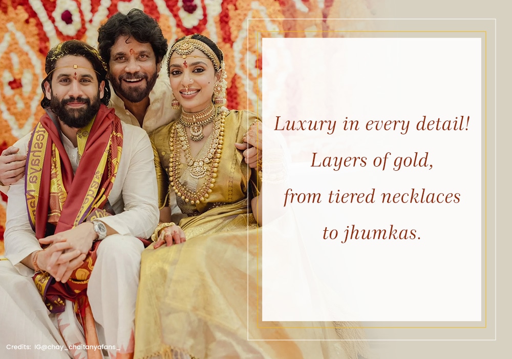Sobhita went all out with her gold and kundan temple jewellery. She wore layered gold necklaces, a maang tikka, jhumkas, bangles and a unique baju bandh that complemented her bridal outfit. Her choice of jewellery was nothing short of spectacular and gave her look a dreamy royal feel. This bridal attire of Sobhita made sure she stole all the spotlight with elegance from top to bottom.