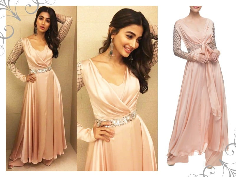 The sultry blush ink color itself steals our hearts and to top it off, the silhouette is just so refreshing! The beautiful Mohenjo Daro actress, Pooja Hegde, gives the traditional anarkali set look an update in this Mahima Mahajan outfit.