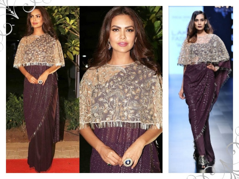 Esha Gupta in Payal Singhal The gorgeous Esha Gupta wears a Payal Singhal sari and cape ensemble and looks every bit regal. In deep purple, the sari is decked with mukaish embellishments and fringed edges.