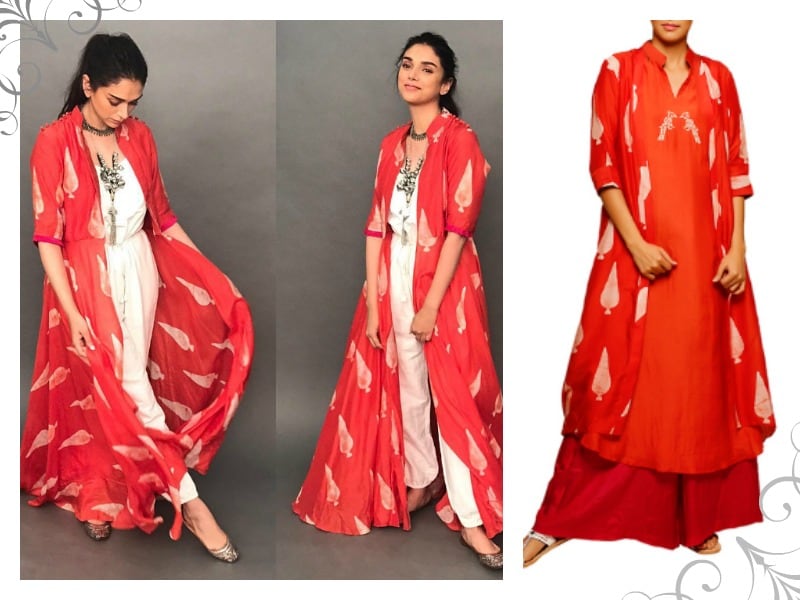 Aditi Rao Hydari in MyohoThe stunning Aditi Rao Hydari has been giving us major style goals with her ethnic as well as modern looks. Here she aces the easy chic look with layering her jumpsuit with long red printed jacket. Loving it!
