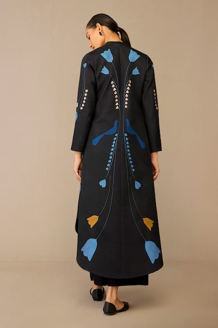 طقم جاكيت أسود دخاني يتميز بجاكيت طويل بتطريز زهري، وكرتا داخلي، وسروال بالازو. الجاكيت مصنوع من الحرير الخام ويتضمن عناصر تصميم معقدة.