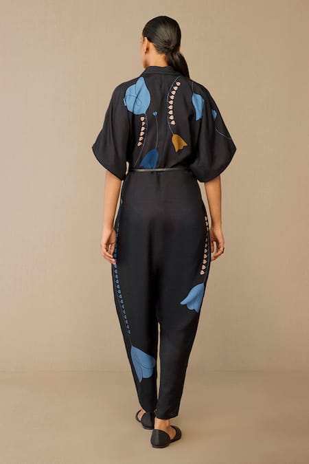 بدلة سوداء دخانية مصنوعة من الحرير الخام تتميز بقصة مريحة وحزام للتعديل. تتضمن عناصر أنيقة مثل الزخارف الزهرية وتفاصيل الأزرار على طول الواجهة.