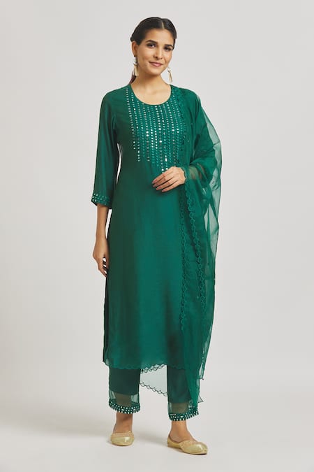 طقم كورتا وبنطال أخضر من الأورجانزا، شانديري، موسلين مطرز بدوائر