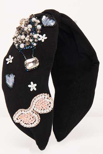 Black hairband with embroidered sunglasses & heart motifs detail.