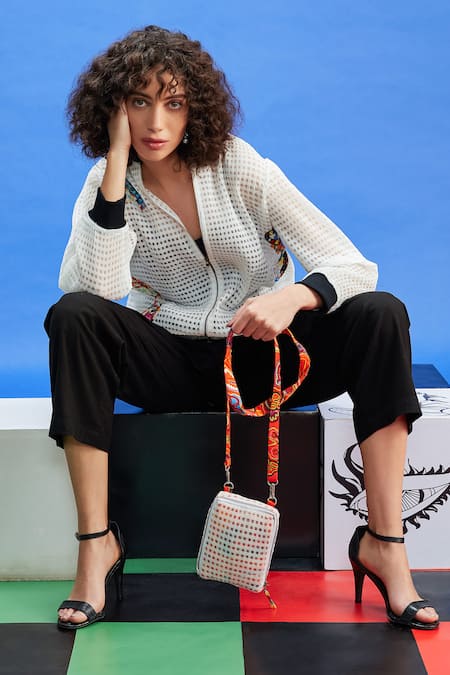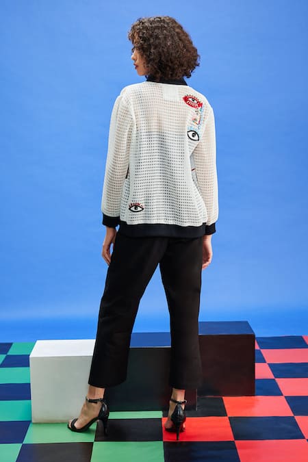 جاكيت بومبر أبيض يتميز بتطريز ترتر وخز على شكل عين شريرة مع رقع مزينة على قاعدة منقوشة مربعة