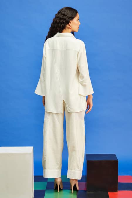 قميص بألواح غير متماثلة باللون العاجي يتميز بأنماط تجريدية مطرزة بخيوط