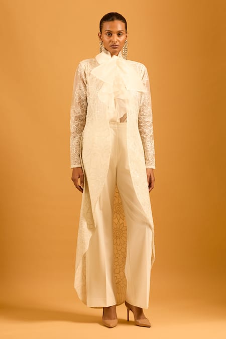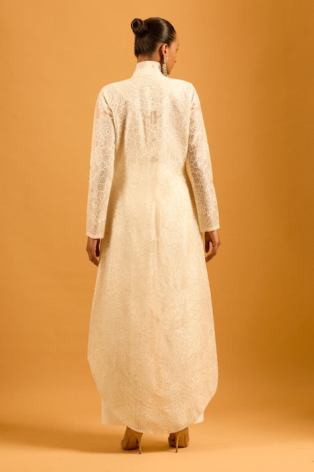 جاكيت من الأورجانزا الحريرية بلون عاجي بتصميم عالي ومنخفض مع تطريز شبكي زهري.