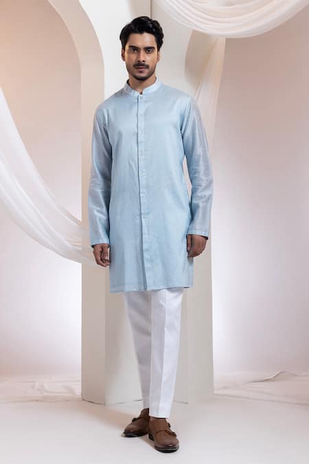 طقم كورتا بلون أزرق سماوي يتميز بأنماط هندسية مطرزة باللون الأبيض على الواجهة وزخارف خرز دقيقة على الياقة والأكمام. يجمع الكورتا بين التطريز الأنيق وقصة مريحة، ويأتي مع بنطال أبيض.