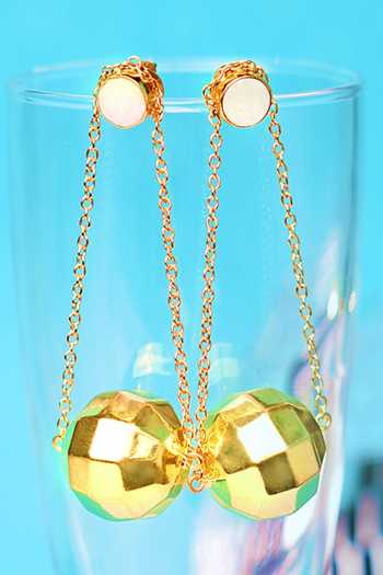 أقراط متدلية ذهبية تتميز بزخرفة من عرق اللؤلؤ الأبيض وتصميم بنقش كرة الديسكو