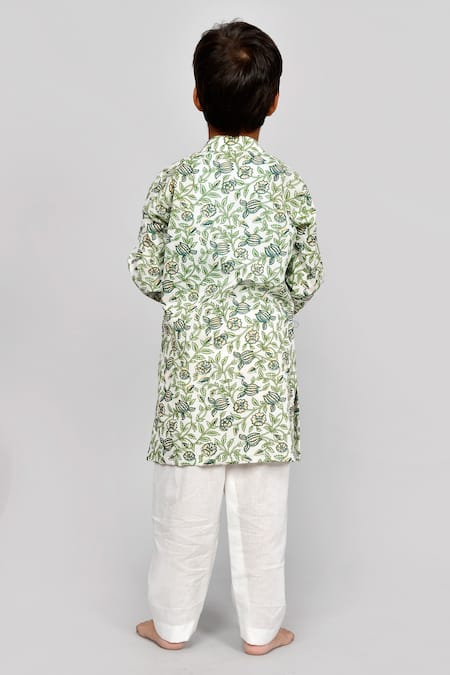 كورتا خضراء تتميز بطبعة شبكية زهرية مع شقوق جانبية وبطانة أمامية بأزرار. مقترنة بسروال بيجامة أبيض متباين.