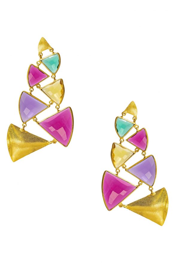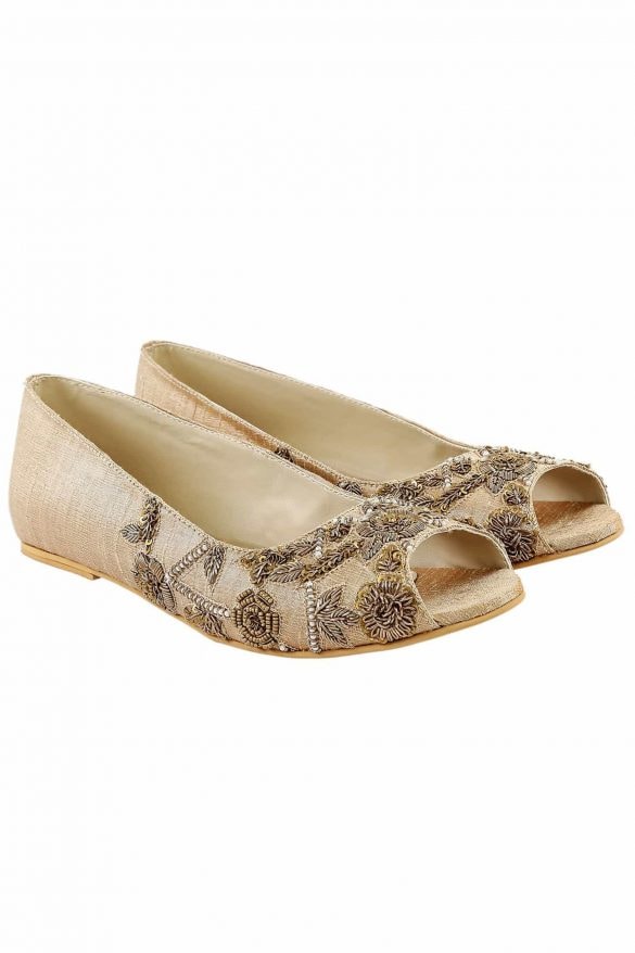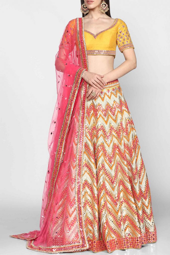 Ever thought of a wedding attire which is simple yet unconventional at the same time? A lehenga, so modest in the silhouette but atypical in its ornamentation, is exactly what Abhinav Mishra is aiming for. The white chevron mirror-worked lehenga features hints of citrus hues like yellow and pink and is perfect for a laid back bride. Merchandize this outfit by pairing it with a pair of kundan earrings and a maangtikka set or haathphool. Keep the ‘dressed down’ vibe alive with some minimalist nude makeup and sequined golden juttis.