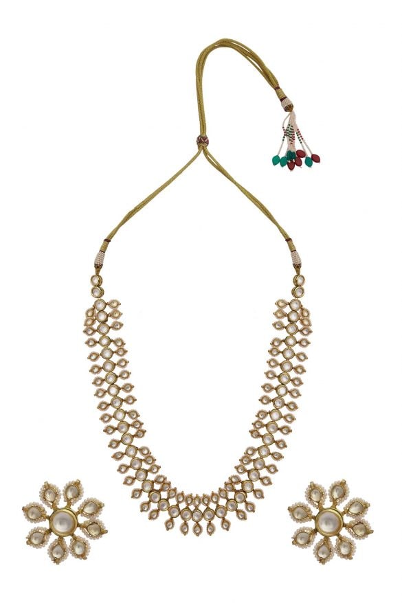 Imagine an all-red lehenga with an abundance of floral cut dana embroidery and a sheer cape; sounds ethereal, doesn’t it? This vivid imagination is brought to life by Anushree Reddy’s pop red lehenga set with a noodle strap blouse. This immensely detailed lehenga can be paired with an off-kilter meenakari kundan necklace and earrings. Keep the rest of the look minimal and in tandem with the accessories. Pair it up with red heels and rock the glorious modern lehenga.