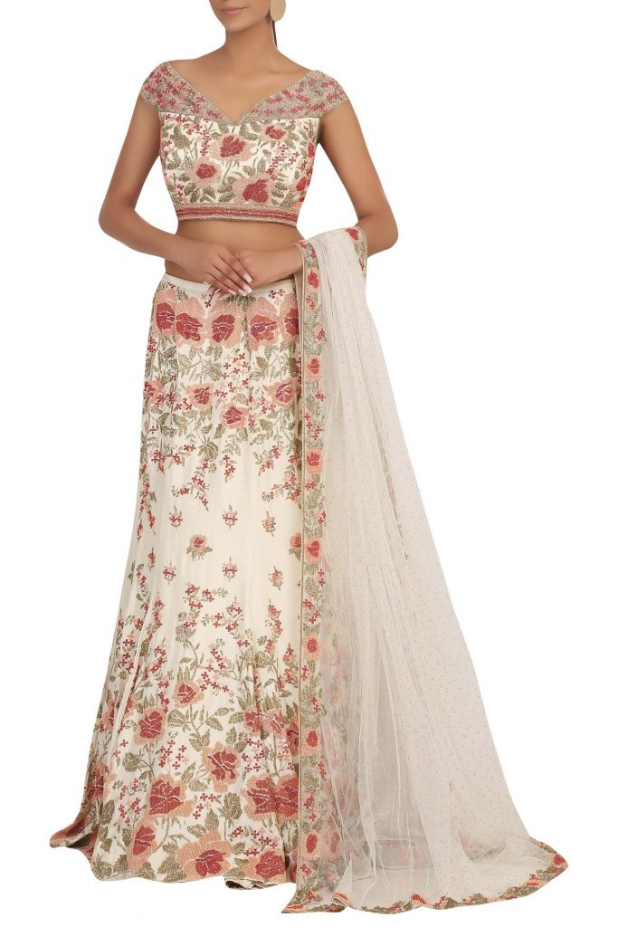 This white Tarun Tahiliani lehenga is for today's quintessential modern bride. Ditching the traditional colour palette of reds and maroons, this embroidered white piece with spaghetti strap blouse manages to catch the attention of everyone. With colourful thread embroidery and jacquard blouse, this elegant outfit can be paired with multi-layered gemstone necklace set, jutti and colourful trendy rings. Avoid over-accessorizing. Go bold with eye makeup with emerald green eyeliner and subtle skin and lips.