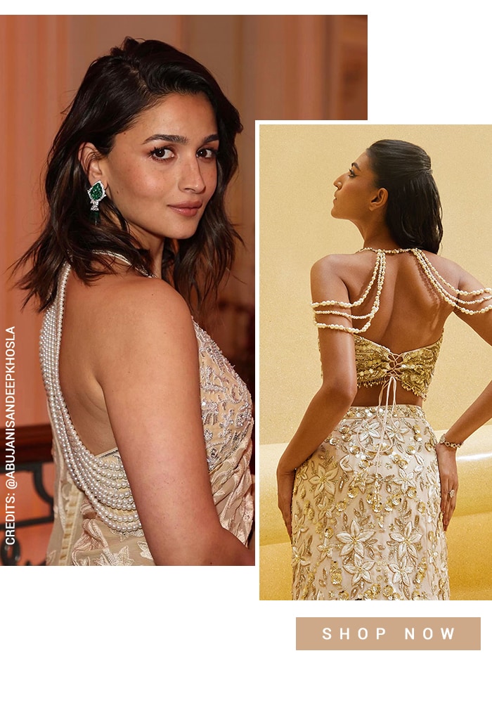 Be the frontrunner in making a jaw-dropping style statement like Alia Bhatt in a halter-neck blouse with a back design. Her unmissable photo from her Mehendi ceremony makes it clear that a halter-back style blouse is a fail-safe choice for your pre-wedding festivities. A fashion trend favoured by minimalist brides, this blouse's back design is a lesson in chic styling. Try a similar style blouse that we handpicked to transition from daytime functions to evening soirees.