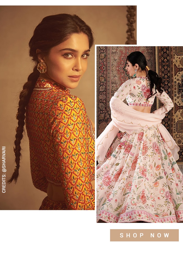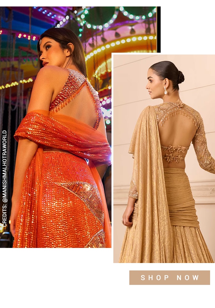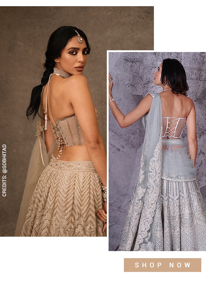 Razor-blouse back trend continues to reign as a classic choice for all occasions. It is also the finest creation fashion has to offer. The conversation-starter design is underpinned by edginess and versatility, and can be easily paired with contemporary lehenga skirts too.