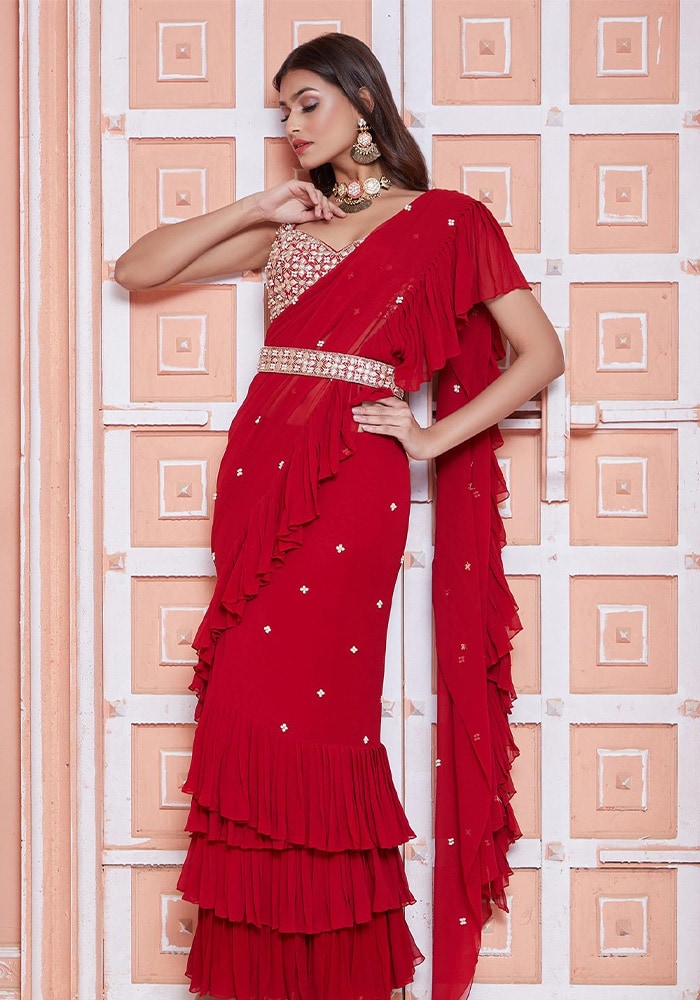 If you love sarees but find draping them a hassle, pick pre-draped sarees. To enhance this style, choose statement necklaces and earrings that match the saree's color palette. Kundan or pearl jewellery can add an extra layer of sophistication.